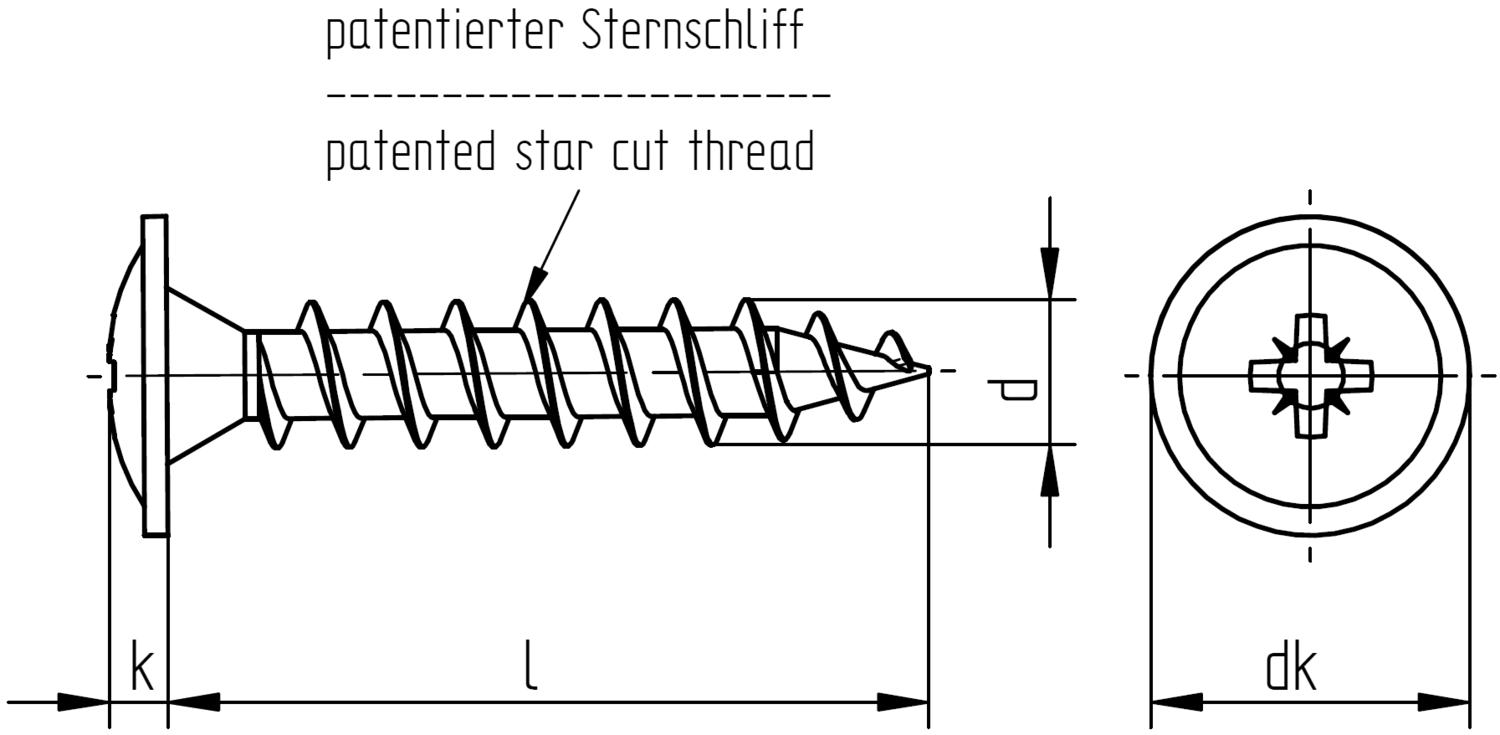 I-Stern, Senkkopf, Vollgewinde Fräsrippen unter dem Kopf A2