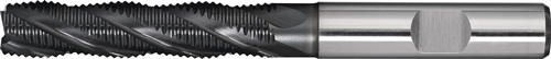 HSS-Co PM · ALCRONA-beschichtet · DIN 844 · Typ HR · Vierschneider · lang · 45° Schutzfase · Zentrumschnitt · Zylinderschaft mit Mitnahmefläche · rechtsschneidend · zum Fräsen von Werkstoffen bis ca. 1400 N/mm² Festigkeit · verbesserte Werkzeugsteifigkeit durch konischen SpannutengrundWeitere technische Eigenschaften: