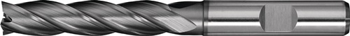 HSS-Co8 · DIN 844 · Typ N · Vierschneider · lang · Zentrumschnitt · Zylinderschaft mit Mitnahmefläche · rechtsschneidend · zum Fräsen von Werkstoffen mit geringer und mittlerer Festigkeit bis ca. 800 N/mm² mit unbeschichtetem Werkzeug und 1200 N/mm² mit beschichtetem WerkzeugWeitere technische Eigenschaften: