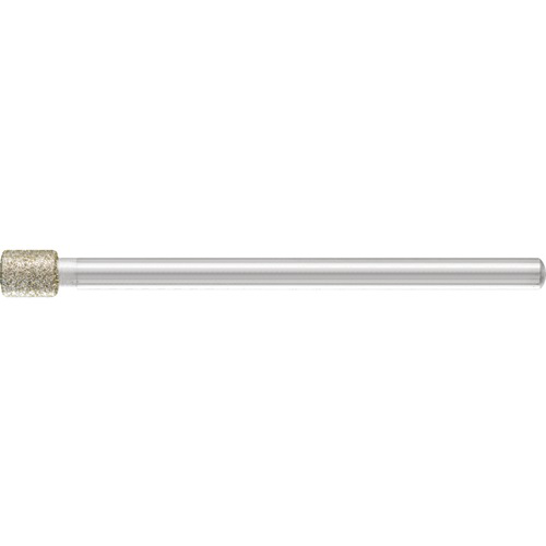 Zylinderform · galvanisch gebundenes Diamantwerkzeug zum Schleifen von Bohrungen, Radien und Konturen im stationären und im Handeinsatz · zur Bearbeitung von Hartmetall, Glas, Keramik, Porzellan, feuerfesten Werkstoffen, Ferrit, Silicium, Graphit, Gummi usw. · Schleifstifte ab einem Durchmesser von 8 mm haben eine Aussparung an der Stirnfläche · empfohlene Umfangsgeschwindigkeit Vc =Trockenschliff 8 - 18 m/s