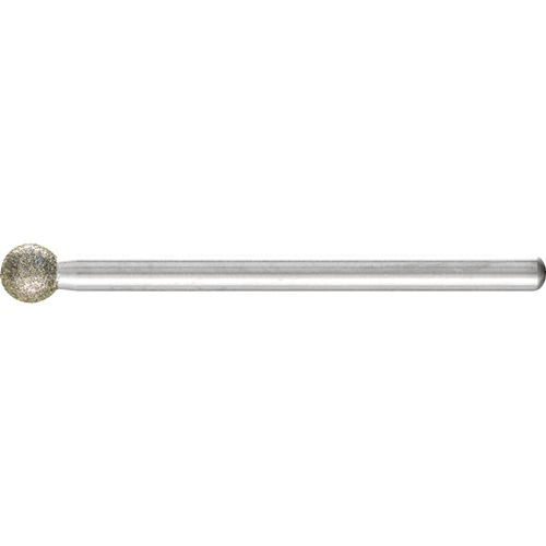 Kugelform · galvanisch gebundenes Diamantwerkzeug · zum Gravieren, Schleifen von Konturen und Entgraten geeignet · zur Bearbeitung von Hartmetall, Glas, Keramik, Porzellan, feuerfesten Werkstoffen, Ferrit, Silicium, Graphit, Gummi usw. · die Kugelform wird häufig im handgeführten Einsatz genutzt · empfohlene Umfangsgeschwindigkeit Vc =Trockenschliff 8 - 18 m/s