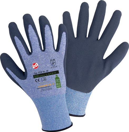 nach EN ISO 21420:2020, EN 388:2016+A1:2018 · Kat. II · Material: Mix von RPET (55% recyceltem Polyethylenterephthalat) / Polyester und Elasthan · hellblau meliert, mit dunkelblauer, gesandeter Latex-Beschichtung in der Innenhand · angenehm weiches und geschmeidiges Tragegefühl · optimale Griffsicherheit und Rutschfestigkeit · sehr gute Fingerfertigkeit und perfekte Passform · Anwendung: für leichte bis mittlere Arbeiten aller Art z. B. Handwerksbereich, Montagearbeiten, Sortierarbeiten, Verpackungsindustrie, Transport, Garten- und LandschaftsbauWeitere technische Eigenschaften: