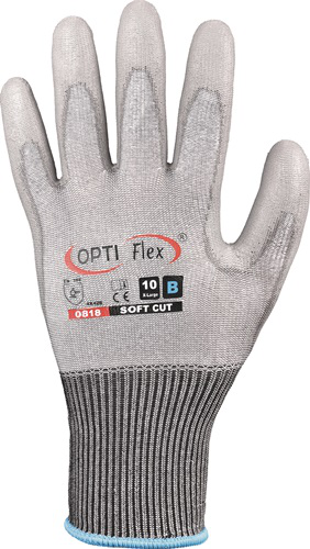 nach EN 388 · Kat. II · Material: 64% Polyethylen (HDPE) / 23% Polyamid / 13% Elasthan, grau, Feinstrick (13gg), nahtlos · flexible und dünne PU-Beschichtung · Schnittschutzlevel B · softer Liner für eine perfekte, ergonomische Passform, Flexibilität und Fingerfertigkeit · sehr gutes TastempfindenWeitere technische Eigenschaften: