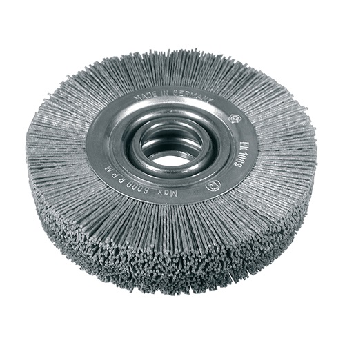 Schleifnylon-Rundbürste mit Siliciumcarbid für die Fertigbearbeitung · zum Einsatz auf Polierbockmaschinen und CNC-Maschinen · Bohrung 31,75 mm Ø · Vorzüge: gleichmäßige Schleifwirkung, da sich bei der Abnutzung des Trägermaterials ständig neues Schleifmaterial freisetzthohe Elastizität und Flexibilität ohne Bruchgefahr