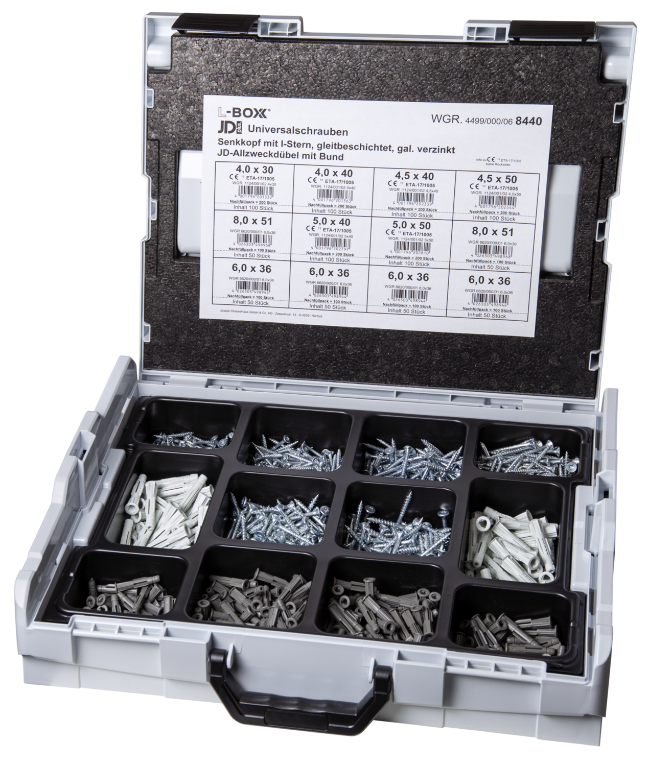 Sortimente -Sortimo L-Boxx bestückt mit: JD Plus Universalschrauben Senkkopf mit I-Stern, verzinkt und JD-Allzweckdübel mit Bund, 8440