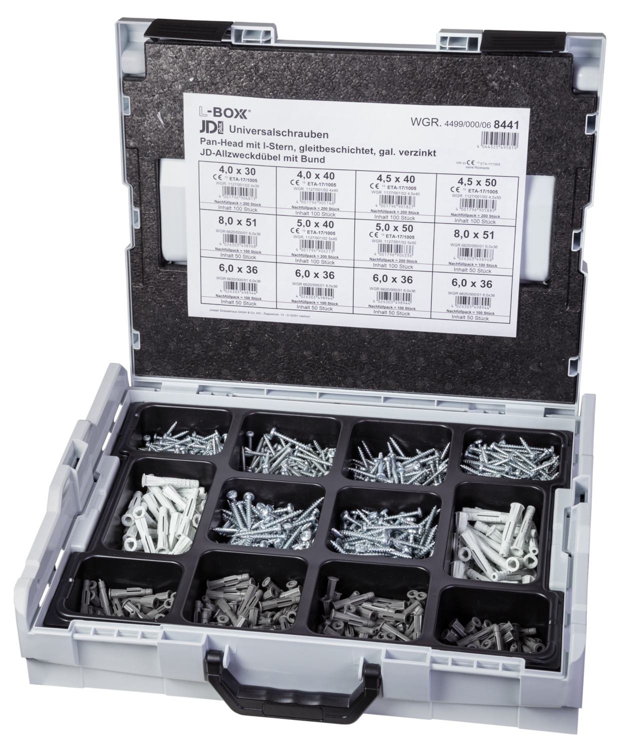 Sortimente -Sortimo L-Boxx bestückt mit: JD Plus Universalschrauben Pan-Head mit I-Stern, verzinkt und JD-Allzweckdübel mit Bund, 8441