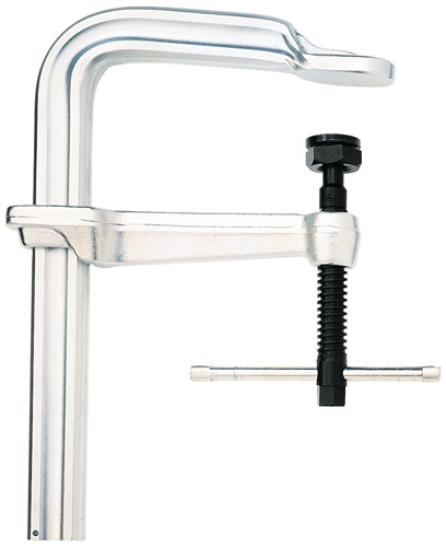 schwer · Schiene, Festbügel und Druckplatte in einem Stück aus statisch optimiertem, kaltgezogenem Profilstahl · warmverformt · vergütet und galvanisch verzinkt · Gleitbügel gesenkgeschmiedet · vergütet und galvanisch verzinkt · Trapezgewindespindel vergütet und brüniert mit verzinktem, durchsteckbarem Knebel · lange Lebensdauer dank hitzebeständiger Spezialdruckplatte mit Sinterstahleinlage, schwenkbar bis 35° · mit Sechskant am Spindelende zum Ansetzen eines Schraubenschlüssels · Spannkraft bis 22000 N (2,20 t) bei einen Anzugsdrehmoment von 70 N.mWeitere technische Eigenschaften: