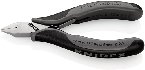 ESD · für feinste Schneidarbeiten z. B. in Elektronik und Feinmechanik · durchgestecktes, spielfreies Gelenk · Schneiden zusätzlich induktiv gehärtet, Schneidenhärte ca. 62 HRC · mit Öffnungsfeder · Spezial-Werkzeugstahl in Sondergüte geschmiedet, mehrstufig ölgehärtet · elektrisch ableitend - dissipativKopf spiegelpoliert