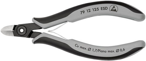 ESD · für feinste Schneidarbeiten z. B. in Elektronik und Feinmechanik · geschliffene, scharfe Schneiden · Schneiden zusätzlich induktiv gehärtet, Schneidenhärte ca. min. 64 HRC · ca. 20% weniger Gewicht · geschraubtes Gelenk · Öffnungsfeder · Chrom-Vanadin-Kugellagerstahl, geschmiedet, mehrstufig ölgehärtet · elektrisch ableitend - dissipativZange brüniert · Kopf poliert