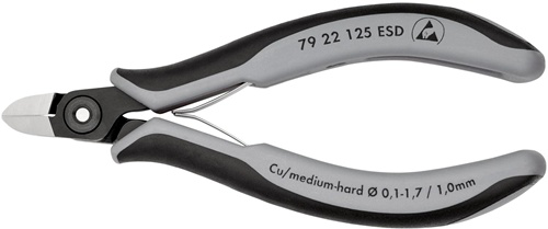 ESD · für feinste Schneidarbeiten z. B. in Elektronik und Feinmechanik · geschliffene, scharfe Schneiden · Schneiden zusätzlich induktiv gehärtet, Schneidenhärte ca. min. 64 HRC · ca. 20% weniger Gewicht · geschraubtes Gelenk · Öffnungsfeder · Chrom-Vanadin-Kugellagerstahl, geschmiedet, mehrstufig ölgehärtet · elektrisch ableitend - dissipativZange brüniert · Kopf poliert