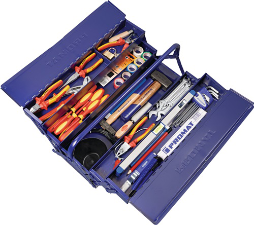 für die Elektroinstallation · bestückt mit hochwertigen Werkzeugen in Handwerker- und Industriequalität · Bestehend aus:1 Stahlblechwerkzeugkasten 5-teilig