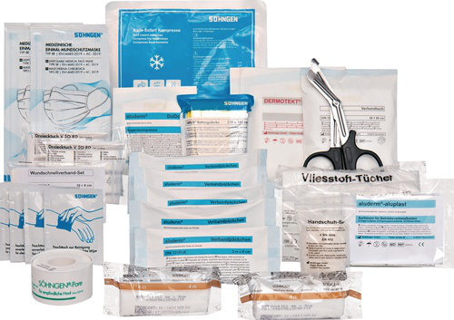 Sterile Verbandstoffe von SÖHNGEN® für Verbandschränke, Erste-Hilfe-Koffer klein + groß sind mit einem Herstellungsdatum und einem Haltbarkeitsdatum von 20 Jahren ab Herstellung versehen. · Der Inhalt entspricht den Mindestanforderungen nach DIN 13157 hinsichtlich Ausführung und Qualität.Weitere technische Eigenschaften: