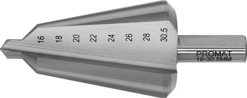 Conical sheet metal bit drill. range 16-30.5 mm HSS overall length 76 mm no. of