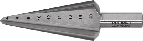 Conical sheet metal bit drill. range 4-20 mm HSS overall length 71 mm no. of cut