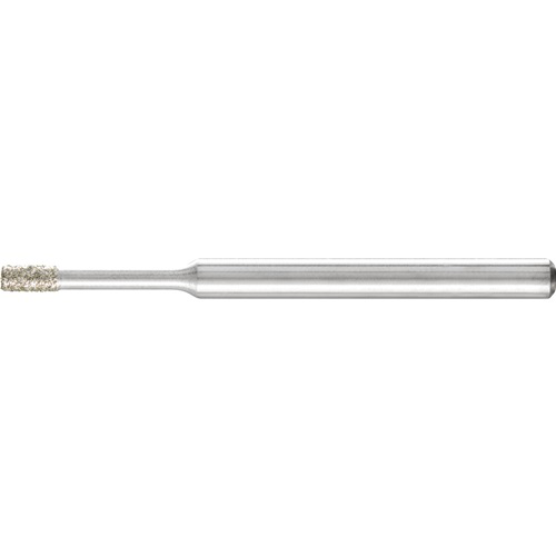 Zylinderform · galvanisch gebundenes Diamantwerkzeug zum Schleifen von Bohrungen, Radien und Konturen im stationären und im Handeinsatz · zur Bearbeitung von Hartmetall, Glas, Keramik, Porzellan, feuerfesten Werkstoffen, Ferrit, Silicium, Graphit, Gummi usw. · Schleifstifte ab einem Durchmesser von 8 mm haben eine Aussparung an der Stirnfläche · empfohlene Umfangsgeschwindigkeit Vc =Trockenschliff 8 - 18 m/s