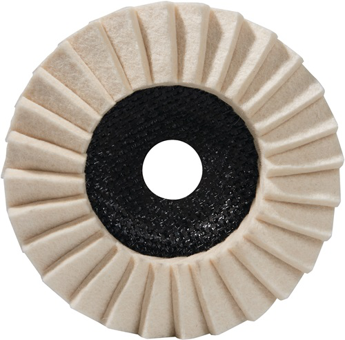 aus 100% Naturfilz · flache Ausführung mit Trägerteller aus Glasfaser · die Flexibilität der einzelnen Lamellen lässt jederzeit einen kühlen Luftstrom zu · mit Polierpasten verwenden, um einen Spiegel-Hochglanz zu erreichen · geeignet für Stahl, Edelstahl (INOX), NE-Metallen, Glas, Kunststoff, Marmor und Stein · für die Bearbeitung von unregelmäßigen oder konturierten Oberflächen geeignet · stets dieselbe Polierpaste mit einer Polierscheibe auf demselben Material einsetzen · für ein optimales Ergebnis, sollte mit einer Geschwindigkeit von 10m/s gearbeitet werden · Bohrung 22,23 mm ØD = Lamellendicke